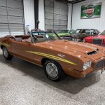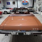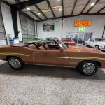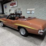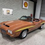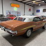 This 1971 Pontiac GTO Convertible is finished in orange with a power-operated white soft top and captures the bold, unmistakable character of early-1970s American muscle. Classic GTO styling cues such as the Endura front bumper, dual hood scoops, chrome grille, hidden headlights, rear spoiler, dual exhaust outlets, and 15-inch Rally wheels wrapped in raised-white-letter tires give it strong road presence. Power comes from a 400ci V8 paired with a 4-speed manual transmission and limited-slip differential, delivering the kind of engaging performance enthusiasts expect from a true Pontiac muscle car. Inside, the brown interior features bucket seats, a center console, woodgrain accents, and full instrumentation for a proper vintage performance feel. A desirable open-air muscle car with authentic style, driver-quality appeal, and strong collector interest, this GTO is an excellent choice for anyone wanting classic Pontiac performance with convertible fun.